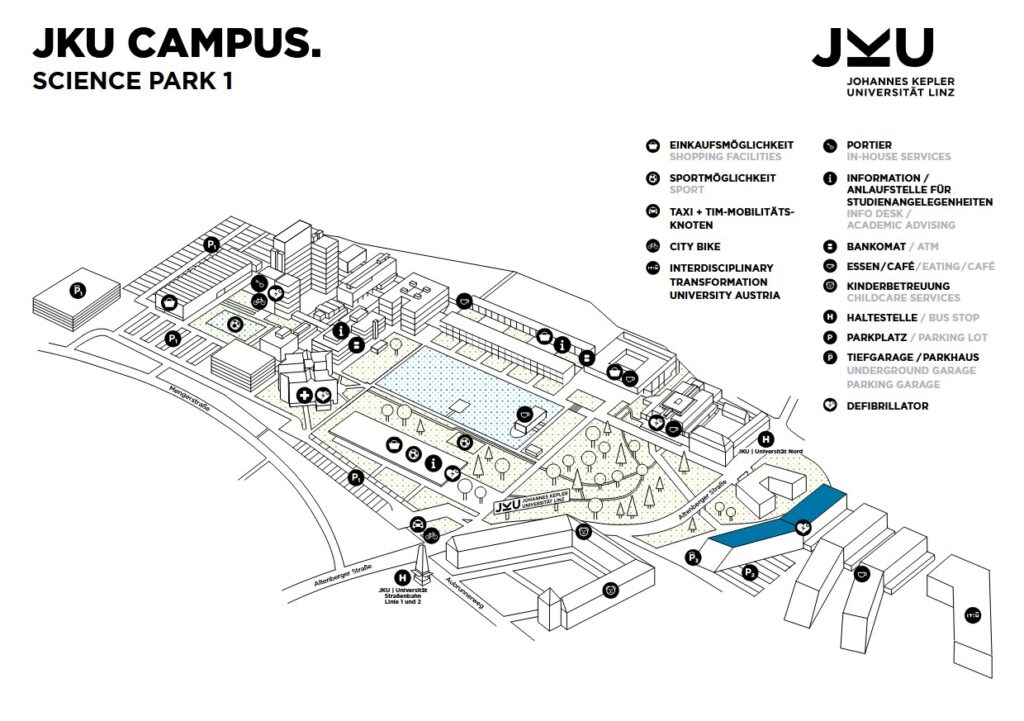 The conference and the workshops will take place at the Science Park 1 at the Johannes Kepler University Linz. Since the mid-60s, the JKU has been located in the northern part of Linz, easily accessible by public transport from the city center. Visitor parking is available at the JKU.